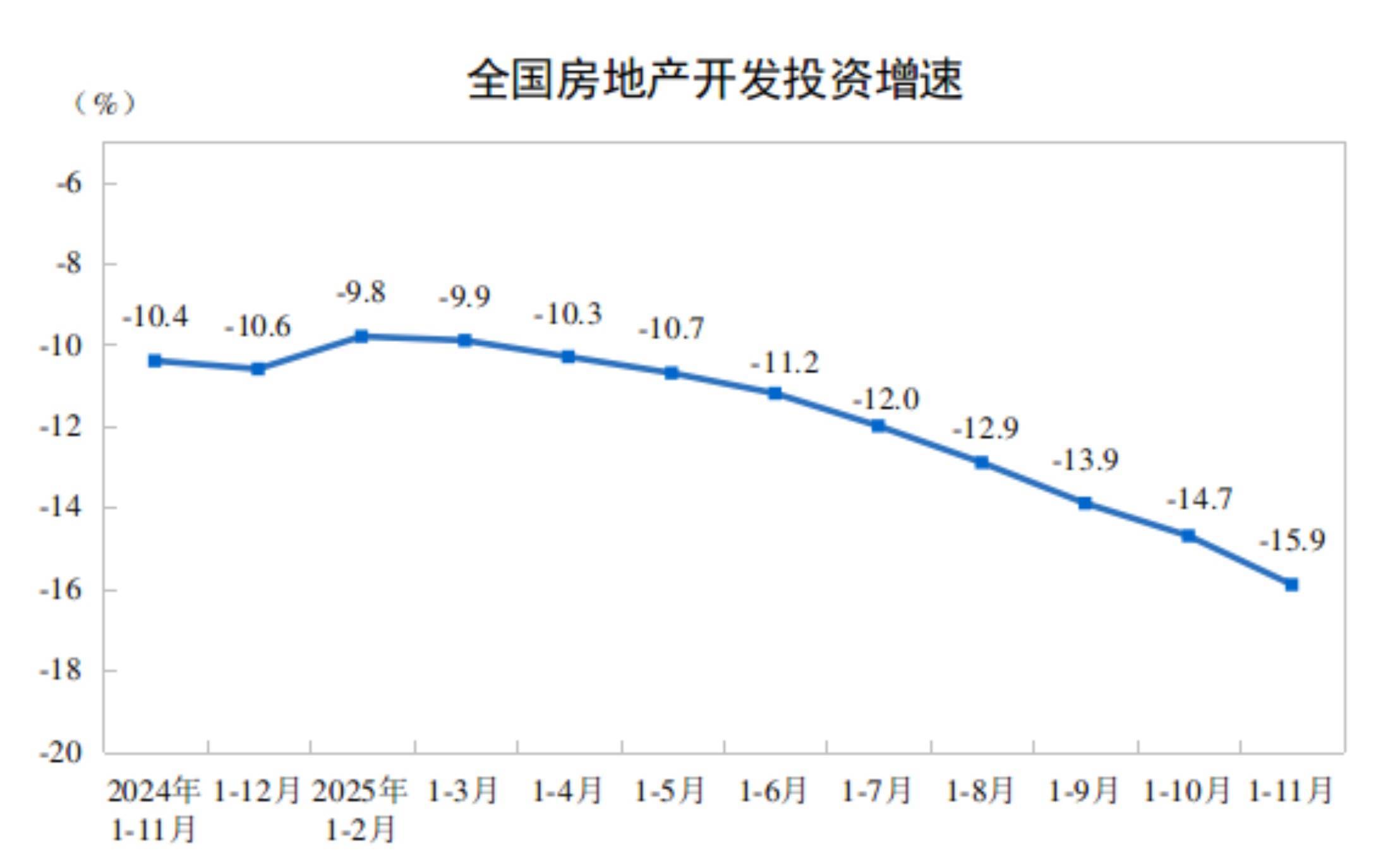 1—11月份,全国房地产开发投资78591亿元,同比下降15.9%;其中,住宅投资60432亿元,下降15.0%。